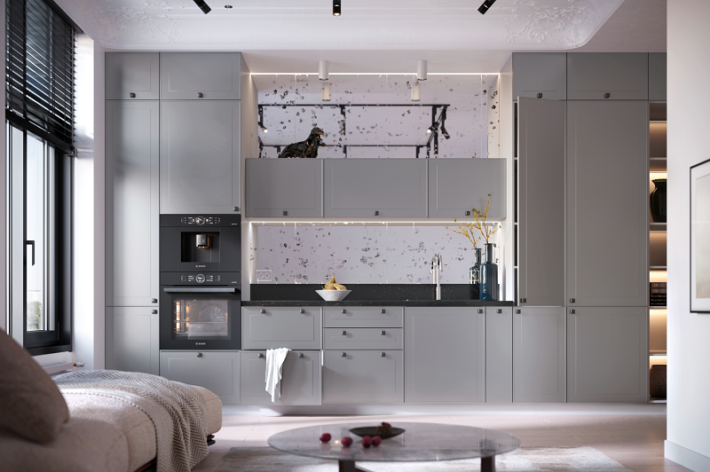 Благородный глубокий серый оттенок - дизайнеры охотно используют в оформлении кухонных интерьеров, ведь с ним легко персонализировать кухонное пространство.