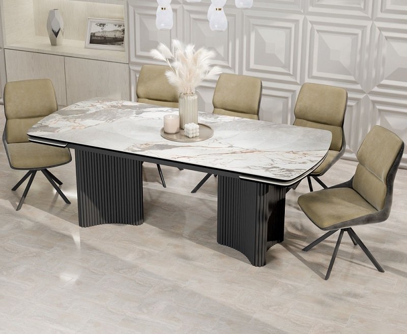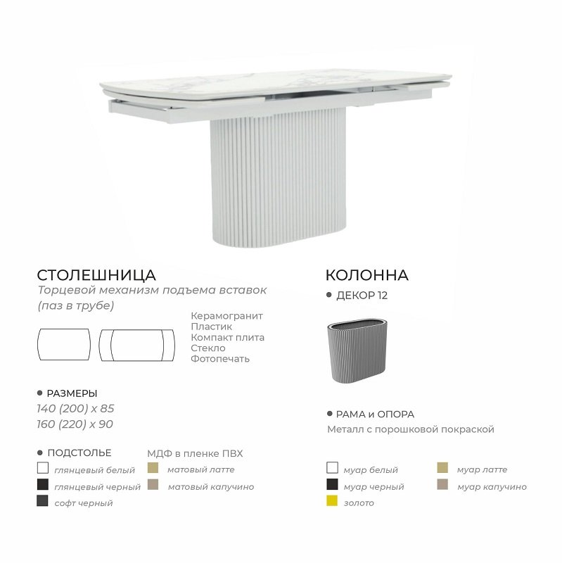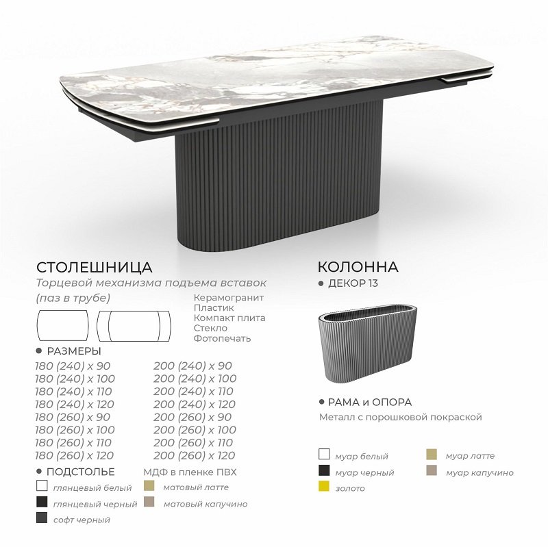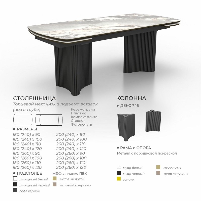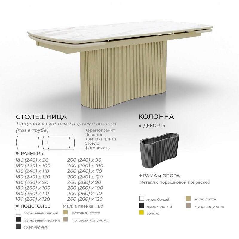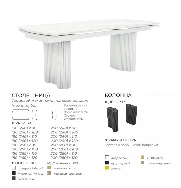 Вставки (с таким же материалом, как и основная столешница), добавляет к столу 60 см или 80 см , торцевой механизм с плавным подъемом вставок