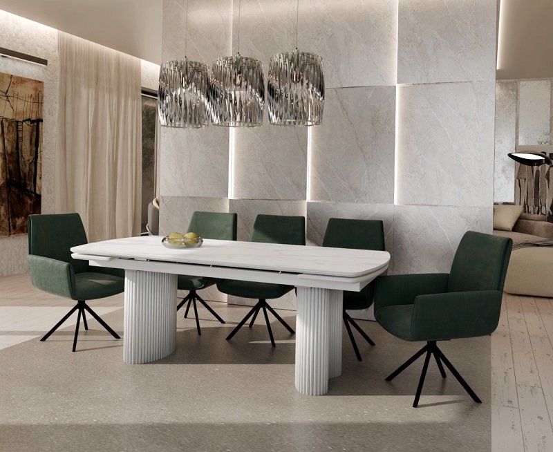 Инновационный раскладной стол с торцевым механизмом подъема вставок , 2 вставки по 30/40см (со стеклом/пластиком/керамикой/ компакт плитой) с каждой стороны. Революционный механизм выдвижения полок в металлическом профиле с использованием пазов - уникальная система надежного крепления.