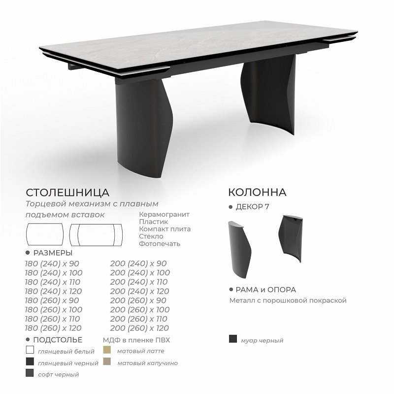 Необычайно большой и красивый стол исполняется в 2х стандартных размерах: 1,8 и 2,0 , но при этом, вы можете выбрать подходящую ширину стола для себя!: ширина стола может быть 90 см, 100 см, 110 см и даже 120 см!!!
