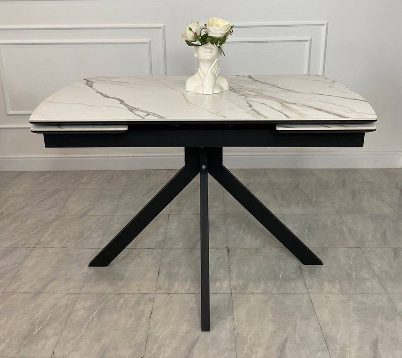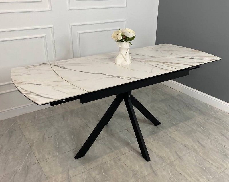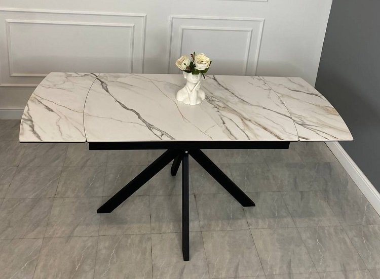 Кухонный стол с изящной и супер современной опорой из металла со столешницей стекла или керамики- на основе МДФ, в современном стиле. Стол оснащён полуавтоматическим раскладным механизмом, выдвигаются 2 вставки по бокам , увеличивая размер стола по 30 см с кажной стороны, основание изготовлено из металла