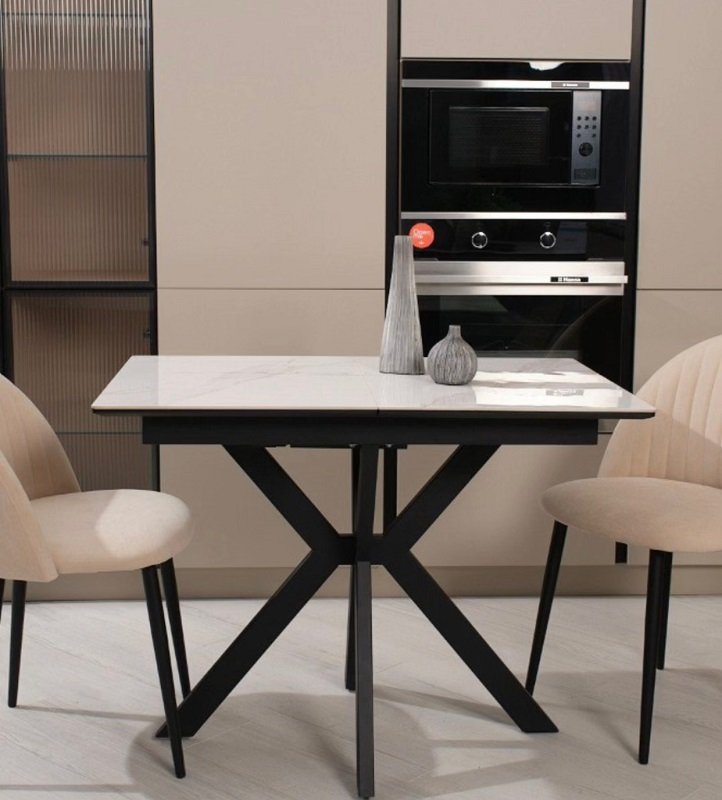 Столешница у стола только с керамикой на основе МДФ. Вставка стола тоже с керамикой, храниться внутри стола. Опора из металла (цвет на ваш выбор!)