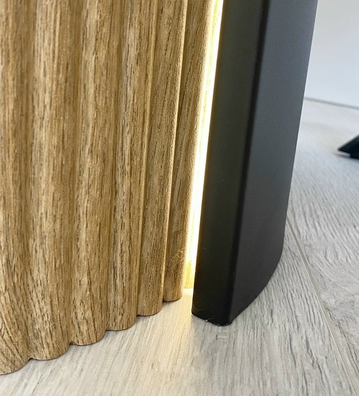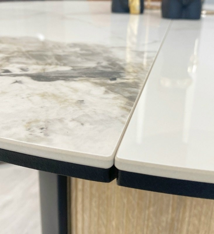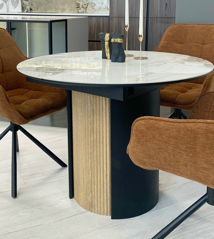 • Стиль и надёжность: керамическая столешница (на основе МДФ) и металлическая опора с изысканным декором под дерево.