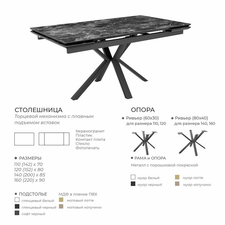 Механиз раскладки- полуавтомат. Вставки по бокам - по 30 см (с керамикой, со стеклом, пластиком или компакт плитой). Торцевой механизм с плавным подъемом вставок