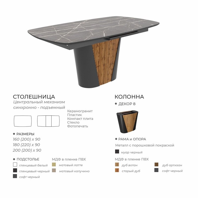 Раскладка-автомат- центральный механизм,синхронно-подъемный прибавляет к столу 40 см, соответственно увеличивается до 2,0 / 2,20 /2,40 см