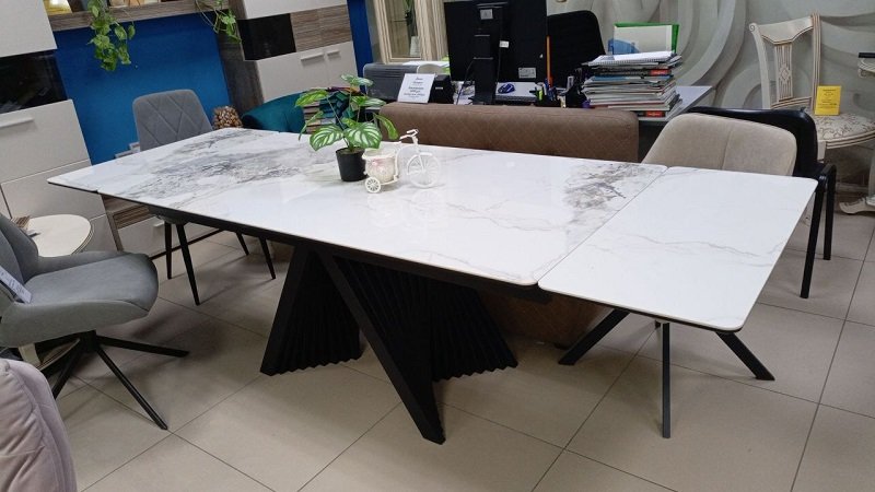 Раскладка- полуавтомат- механизм на подшипниках мягко двигается, прибавляя с кажной стороны по бокам прирост -40 см!!! вставка встает в уровень со столешницей и отлично держит вес! Форму столешницы тоже можно подобрать на свой вкус)))